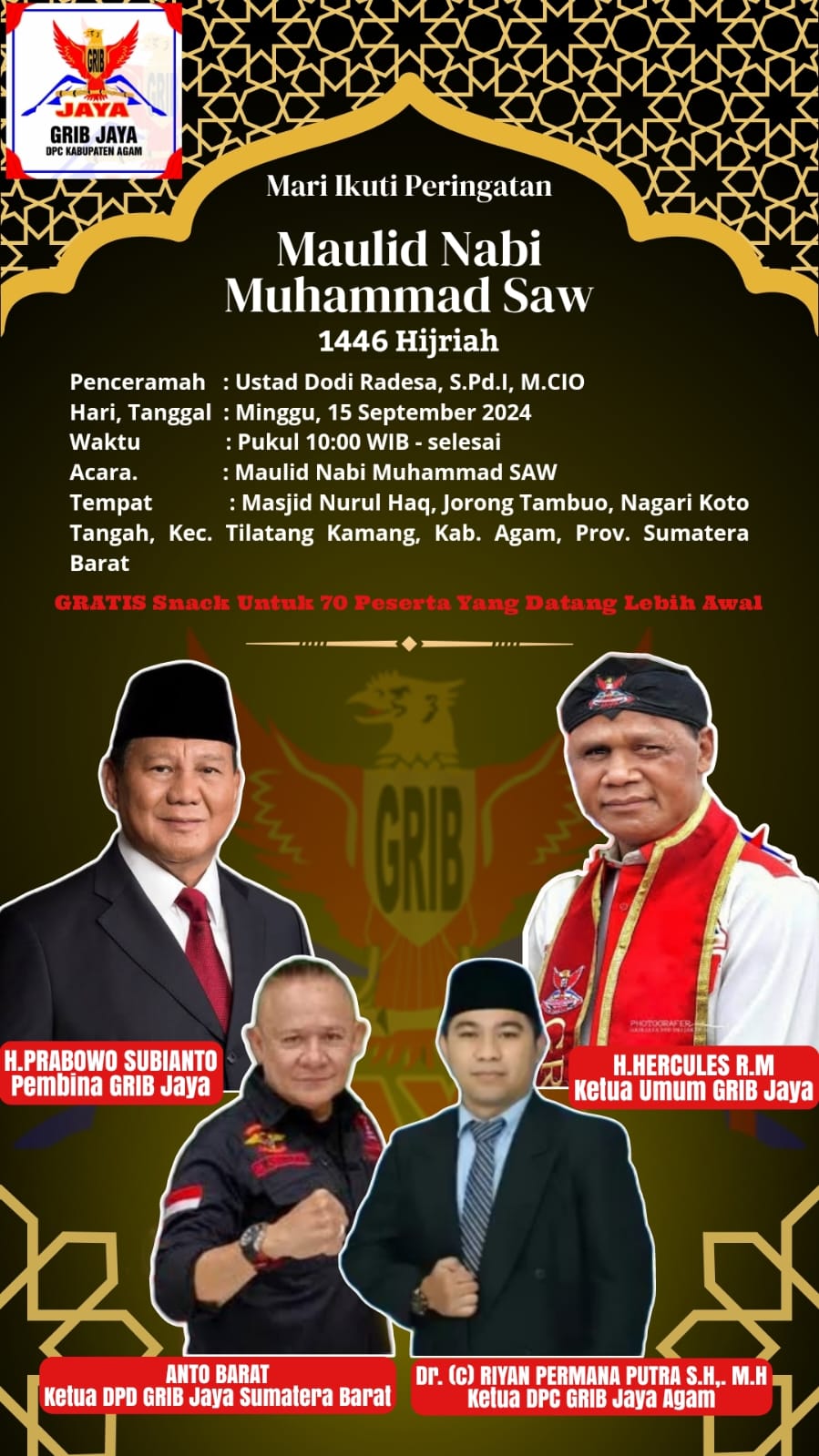 Riyan Permana Putra yang juga menjadi Ketua Tim Hukum/Advokasi Erman Safar – Heldo Aura serta Ketua Tim Hukum/Advokasi partai politik pendukung Erman Safar – Heldo Aura yang merupakan koalisi terbesar di Kota Bukittinggi dengan gabungan Gerindra, Nasdem, Golkar, PKB, PSI, Perindo, PBB, Garuda, Hanura, Gelora, Masyumi, dan Partai Buruh menyatakan bahwa kita ingin catatkan tinta emas sejarah, bahwa DPC GRIB Jaya Kabupaten Agam yang kami rintis titik nolnya adalah mengamalkan nilai religius, dimana bagi anggota GRIB Jaya Kabupatem Agam yang beragama Islam itu dengan salah satunya memperingati Maulid Nabi Muhammad SAW. Yang sesuai dengan Pasal 2 Anggaran Dasar GRIB Jaya Agam, yakni Jati diri Gerakan Rakyat Indonesia Bersatu/GRIB adalah Kebangsaan, Kerakyatan, dan Religius.